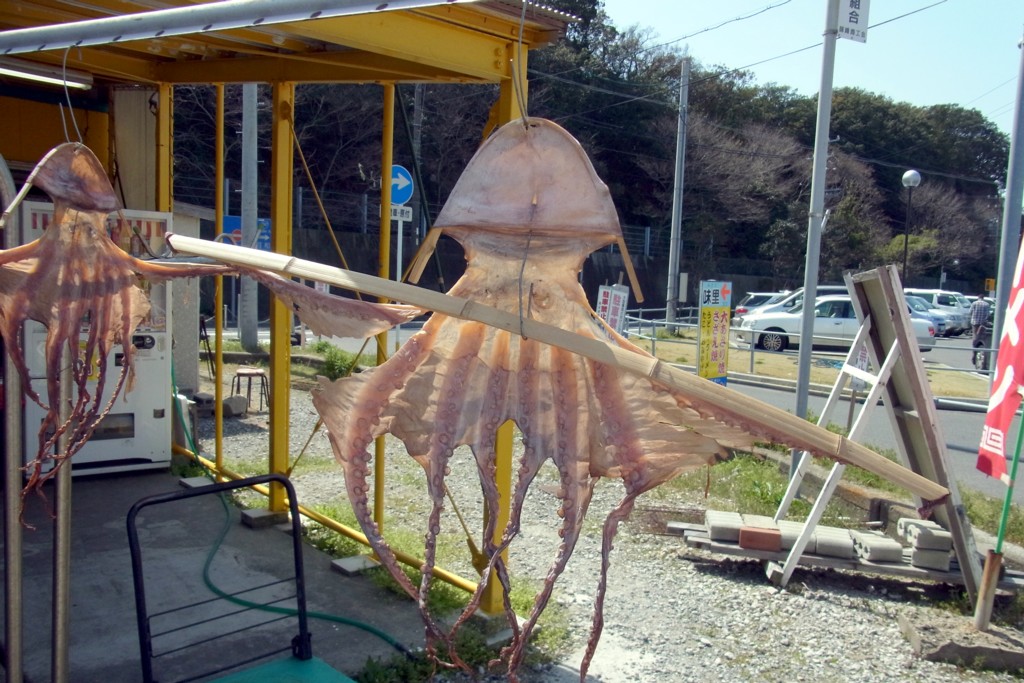 売店には干物や海老せんべいなど特産品がたくさん、外にはイカが干してあるし、貝類や干物を焼くいいにおいがあたりに充満。