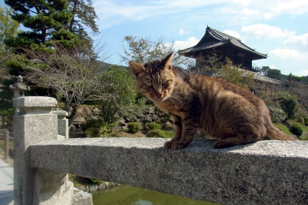 吉香神社へ渡る橋の欄干がテリトリーらしいこのにゃんこ、ずーっと欄干の上で行ったり来たりしてた。