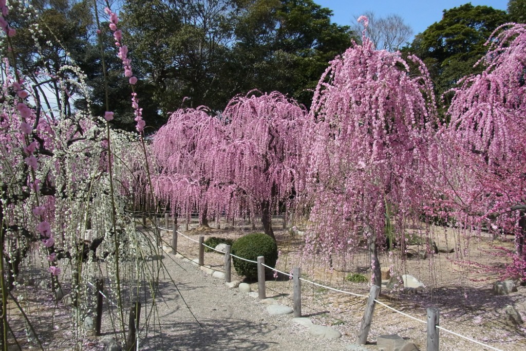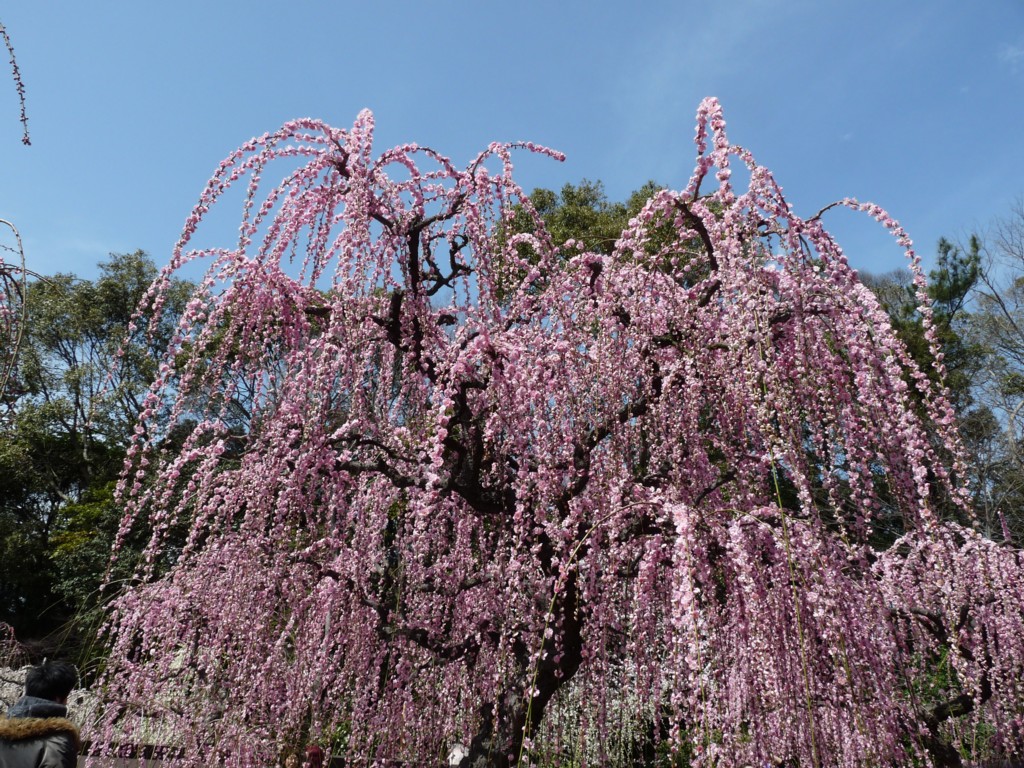 300本ほどもある梅の木のほとんどが<しだれ梅>で、花の色は白いのから濃い赤まであって、一本の幹に白い花と赤い花をつけてるのや、ひとつの花なのに花びらの色が微妙に違うものあってびっくり!
