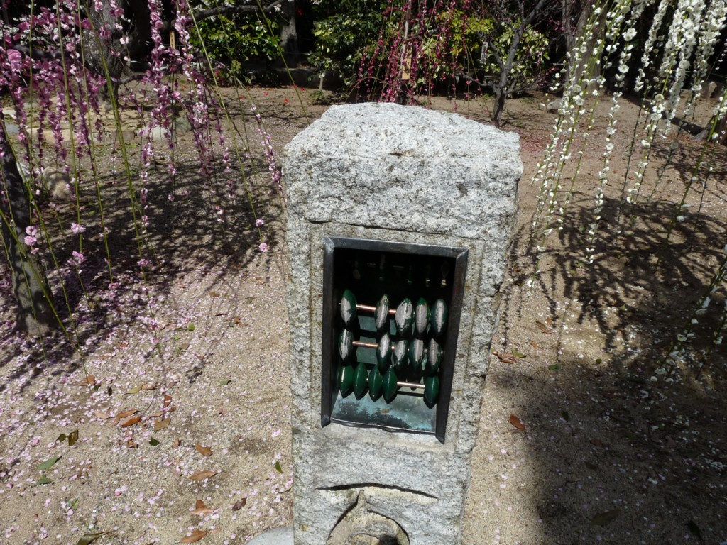 このそろばんの玉の下には「百度石」と書いてあって、お百度参りをするときに数を間違えないように使うものらしいんだけど、5個の玉が4段ってどうやって使うんだろう??