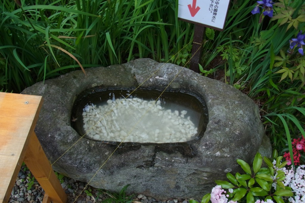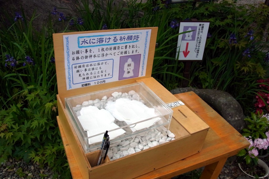 祈願符に願い事を書いて、すぐ右手の石鉢に浮かべて祈願するみたい。