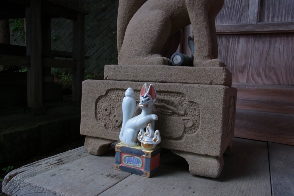 <稲荷神社>もあって、おや?どこかで見かけた陶器の狛狐がいる。