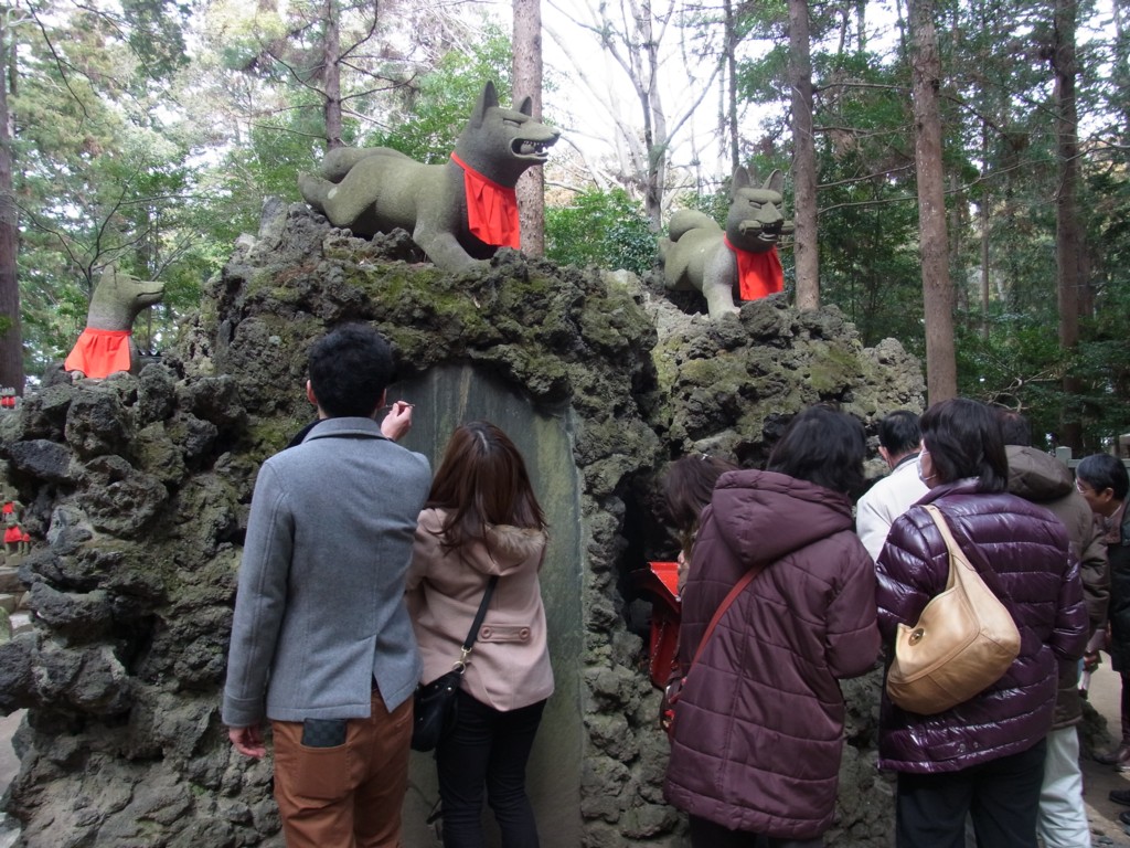 そしてこの信者が奉納したという狐たちに囲まれた岩山に群がる人々が!